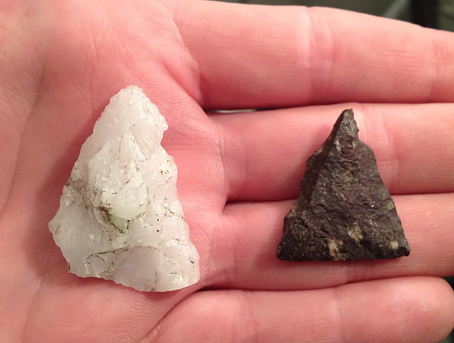 It's a triangular quartz arrowhead, missing one corner. It's crude, chunky. It's a find and I am glad to have it. Here it is cleaned up at home along with a broken fragment from the first place.