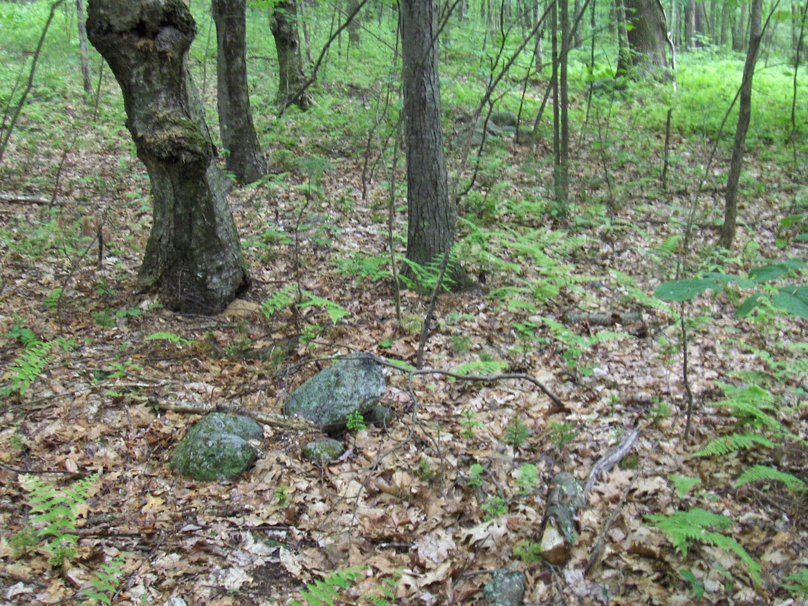 I have no reason to suppose two types of people here, one making rock piles and another using primitive rock splitting techniques. So I want to consider this rock to be an associated "artifact" that is date-able to the early colonial period.