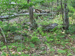 Back at Blood Hill I want to mention one stone wall that fits the "ravine culture" idea I was promoting earlier. This wall came up the hill, hooked around, and ended a few feet later, with a piece of quartz. Perhaps you can make it out in the photo, it is a little bit like the large "J" in the main gully of the hill.